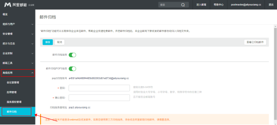 管理员可以在该界面开启邮件归档pop3账号服务及设置密码,用于第三方归档服务,该账号无法登录webmail及收发邮件。