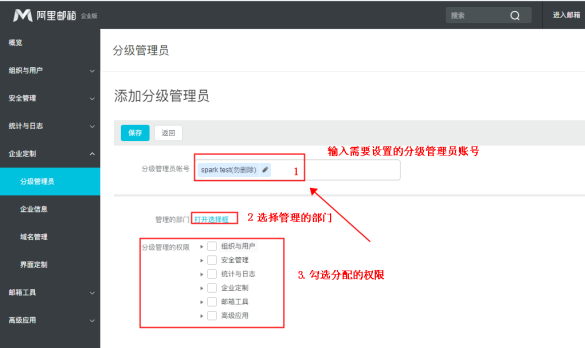阿里企业邮箱除了一个postmaster主管外,公司可以设置多个分级管理员,只要给普通员工账号授权为分级管理员即可。可以设置其能管理的部门范围,可以拥有的域管权限。除不包含再创建二级分级管理员外,分级管理员基本上能拥有同主管一样的权限.