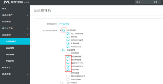 2. 设置分级管理员账号,选择管理员的部门,分配权限