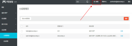5. 注意事项:被设置为分级管理员后,用户登录网页端会先登入管理员后台界面。需要使用用户界面收发邮件可以点击右上角<进入邮箱>按键.