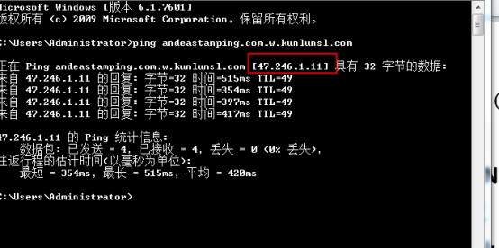 不知道的PING 下当时CNAME的@记录对应的记录值例:andeastamping.com.w.kunlunsl.com